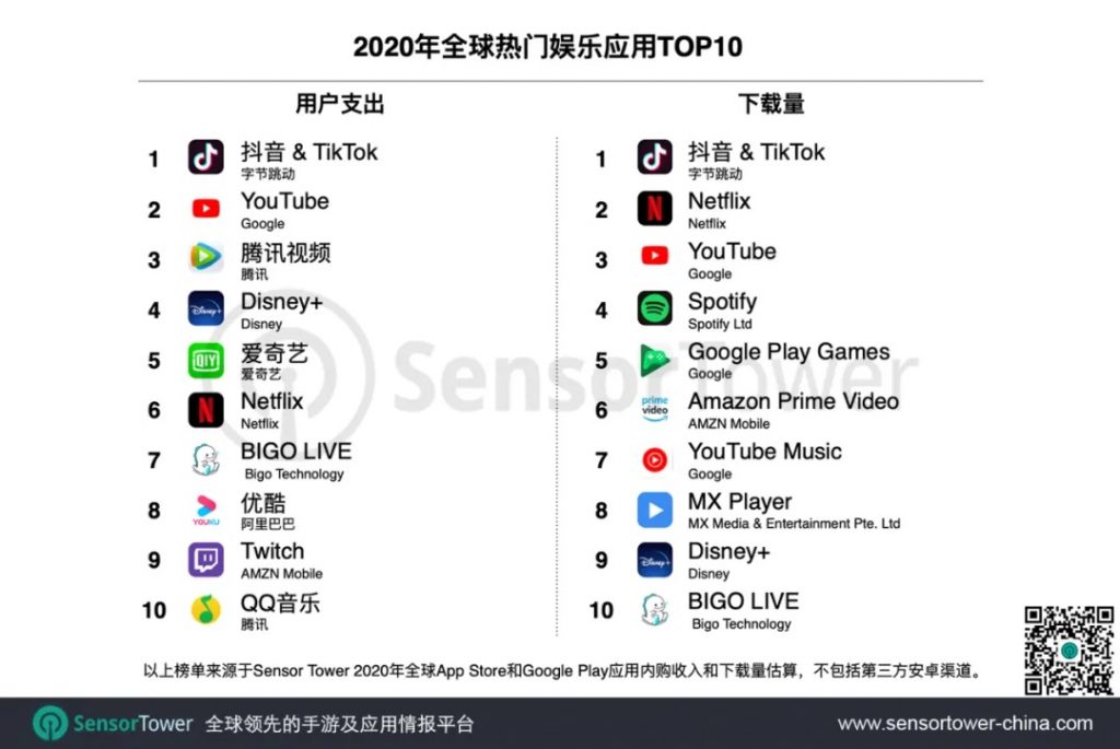 Sensor Tower 公布 2020 年全球热门娱乐应用:抖音及 TikTok 获双榜冠军